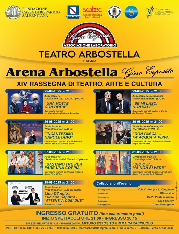 Ritorna, con la sua XIV edizione, uno degli appuntamenti più attesi dell’estate salernitana: l’Arena Arbostella – Premio Gino Esposito, rassegna di teatro e spettacolo all’aperto nella zona orientale della città. L’evento, nato da un’idea del compianto direttore artistico del Teatro Arbostella Gino Esposito, si svolgerà da lunedì 25 a domenica 31 agosto 2025, nello spazio antistante il Teatro Arbostella, con ingresso gratuito fino a esaurimento posti. Ad inaugurare l’attesa rassegna la compagnia nolana “Quelli che… il TEATRO”, con la brillante commedia “Una notte con Dora”, scritta, diretta e interpretata da Marco Lanzuise, affiancato da Feliciana Tufano, Mario Arienzo e Peppe Miccio.