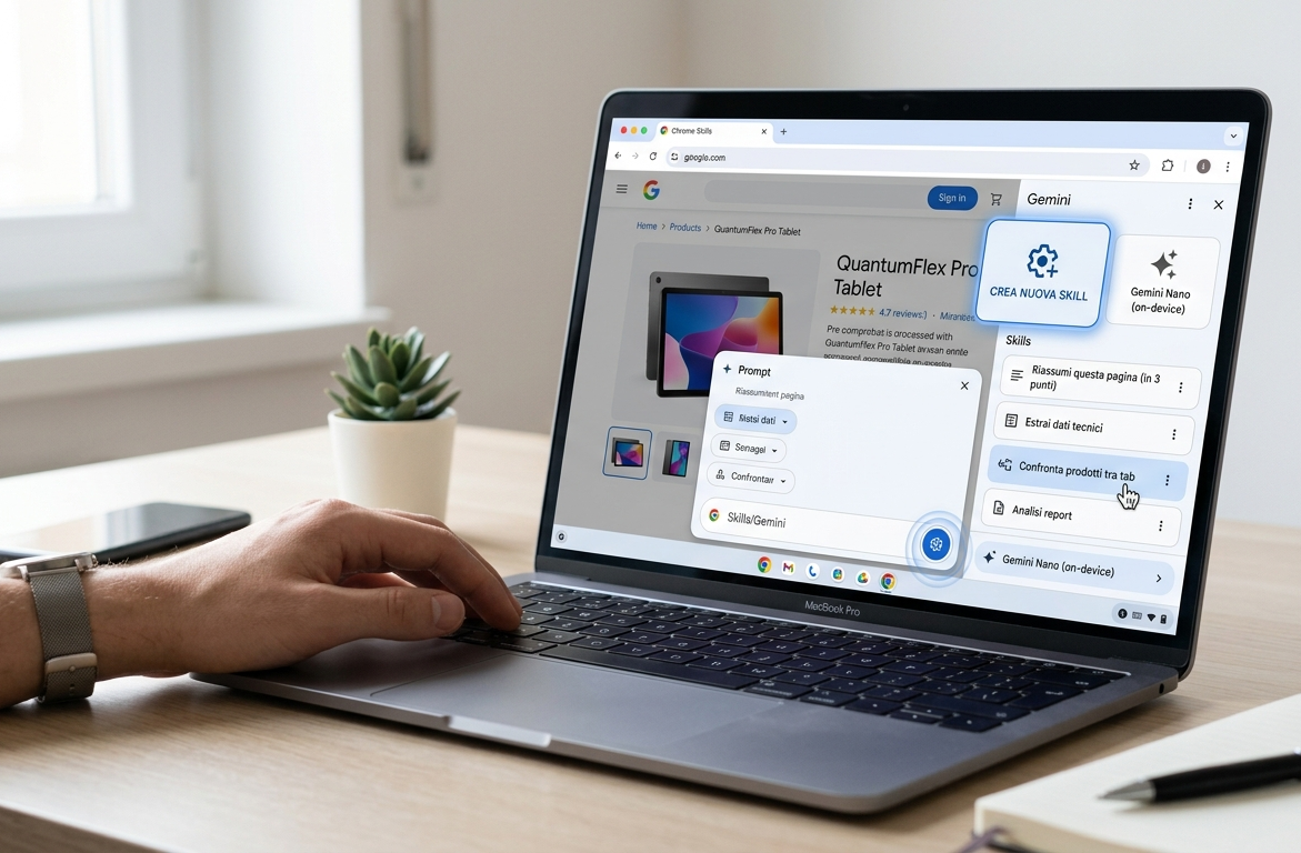 Coinvolgere l’Intelligenza Artificiale durante la navigazione sul web. Con questo obiettivo di fondo Google ha lanciato le Chrome Skills che non sono semplici estensioni, ma workflow AI salvabili e riutilizzabili integrati direttamente in Gemini all'interno di Chrome. L'obiettivo è eliminare la ripetitività: invece di scrivere ogni volta lo stesso prompt (es. "Riassumi questa pagina in 3 punti"), puoi salvare quell'azione come una "Skill" attivabile con un click o un comando rapido.